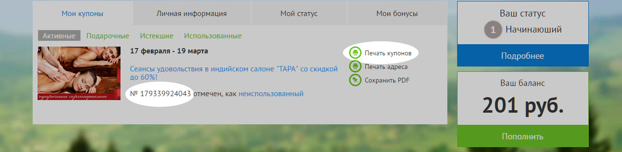 4. После оплаты купон появится в вашем личном кабинете. Вы можете распечатать его или просто сохранить номер любым удобным способом (например, запомнить 12 цифр – отличная тренировка памяти), а затем, получить по нему скидку у поставщика услуг.